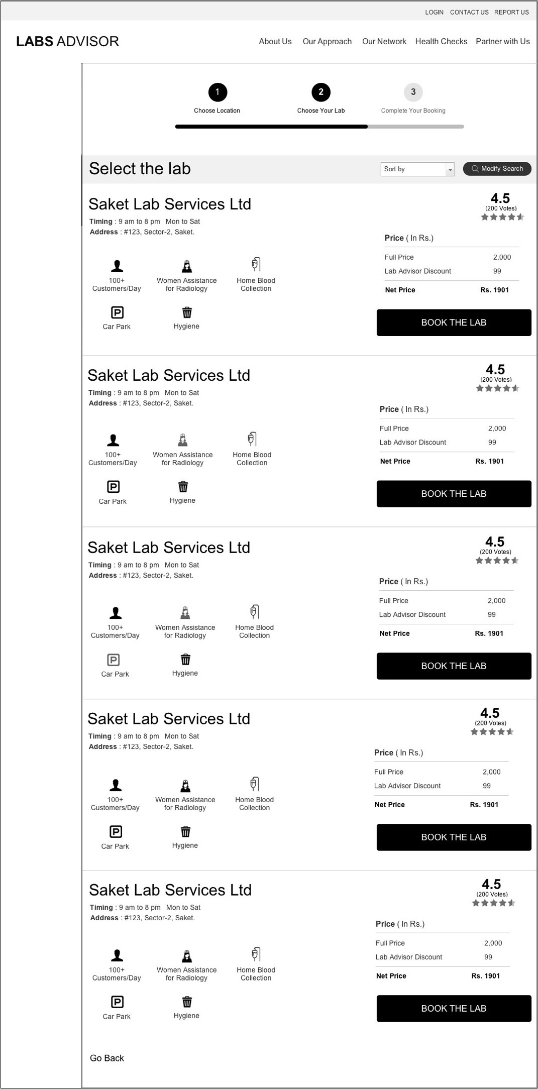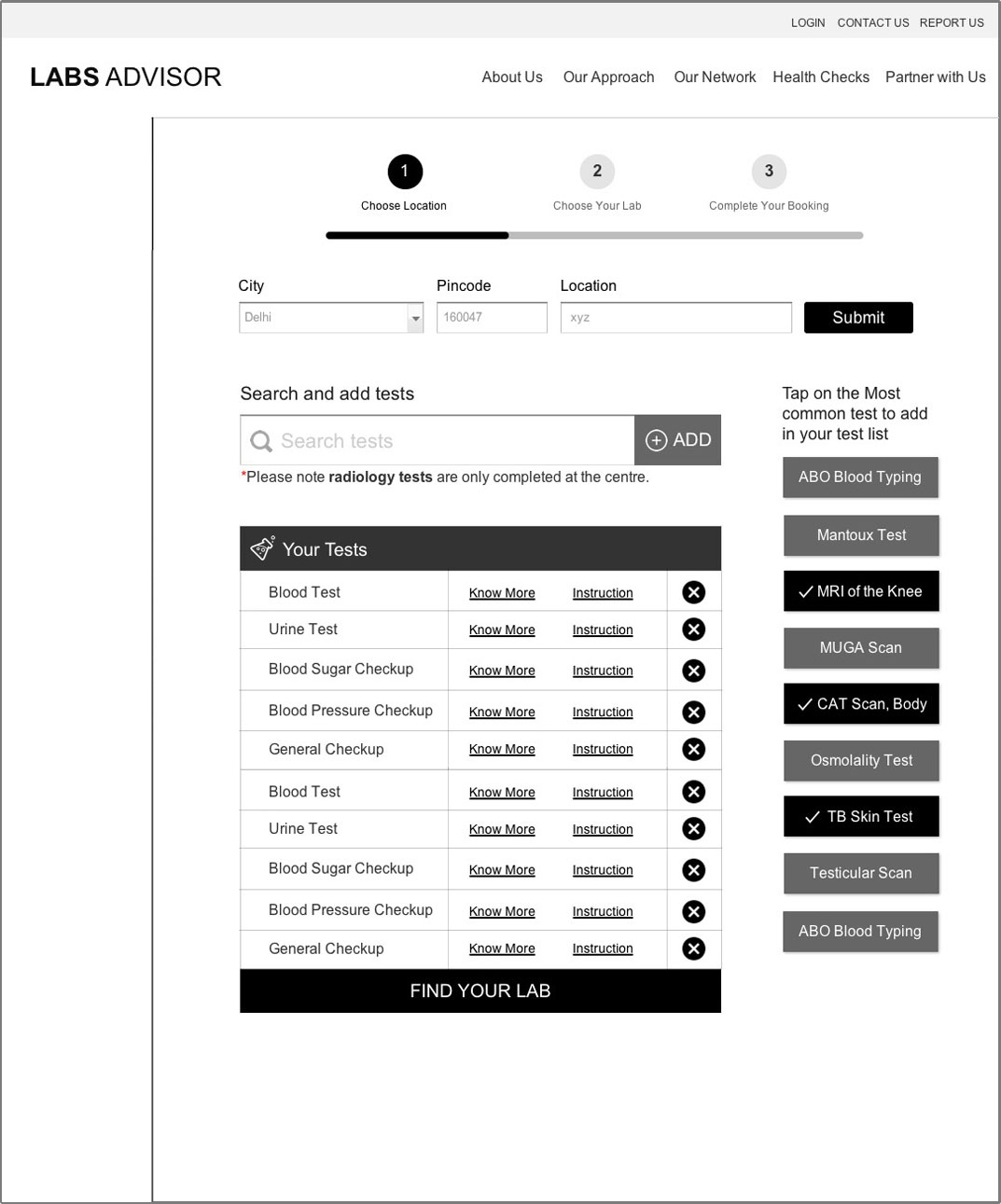 Based on our research we picked up one pain point of users – “How to find a right & affordable lab?“ and designed a solution for it. We introduced our solution as medical tests search engine where a patient can find a lab and book the tests.